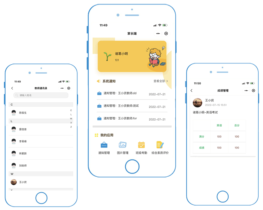 實(shí)現(xiàn)數(shù)字化辦公,對(duì)外向?qū)W生家長(zhǎng)提供各種服務(wù),如:消息通知、請(qǐng)假管理,校園活動(dòng),學(xué)生動(dòng)態(tài),教師通訊錄,學(xué)生定位等各種服務(wù)。對(duì)內(nèi)向教師提供各類服務(wù),如:班級(jí)管理,考勤管理,請(qǐng)假管理,活動(dòng)管理,課堂點(diǎn)名,家長(zhǎng)會(huì)管理,教師課程等等各種服務(wù)